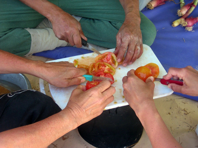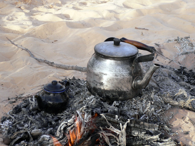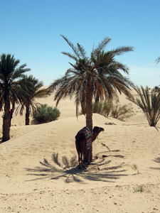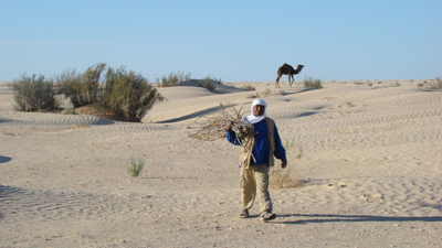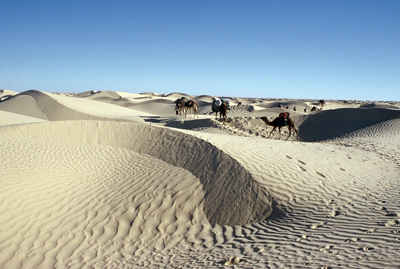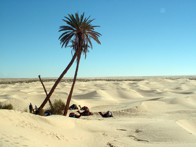 Randonnées au milieu des dunes, des petits chotts, des plateaux. Bivouac.. Rammassage du bois, montage des tentes, préparation du repas pris autour du feu. Méditation au coucher de soleil aux couleurs bleue-mauve de l’est, au chant des chameliers dans le silence du soir. - lundi soir : Zmelet 27, grandes dunes de sable - mardi soir : Mahamed Essleij, un marabout avec un puits - mercredi soir : Elfaraii, sable et végétations - jeudi soir : Lealegueya, anciens palmiers et dune s