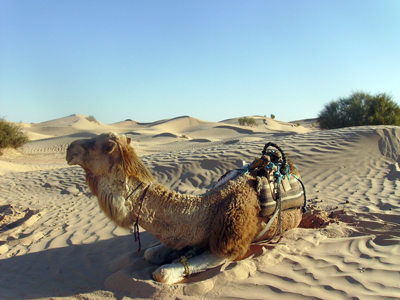 Transfert en minibus vers Sabria. Passage par le chott el Jerid où nous ferons un petit arrêt. Arrivés à Sabria, le dernier village avant le désert, changement de véhicules pour partir vers les dunes en 4x4, environ 20 mn. Accueil par l’équipe de chameliers à Ain echchekh. Déjeuner non loin des dunes, préparé et servi par les chameliers. Pause libre de repos avant de partir en randonnée chamelière jusqu’au bivouac à Lehmedeniya. Au passage, des ruines, des vestiges d’anciennes maisons qui servent d’abri aux bergers. En cours de randonnées, séance de sophrologie. Dîner. Méditation et échanges